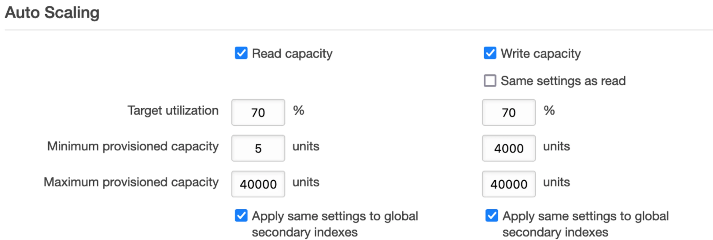 In order to try to make the provisioned mode less rigid, DynamoDB allows you to configure auto-scaling policies. These policies allow you to configure values for min ans max capacity and the percentage of target utilization that will be trigger the alarm to scale up.