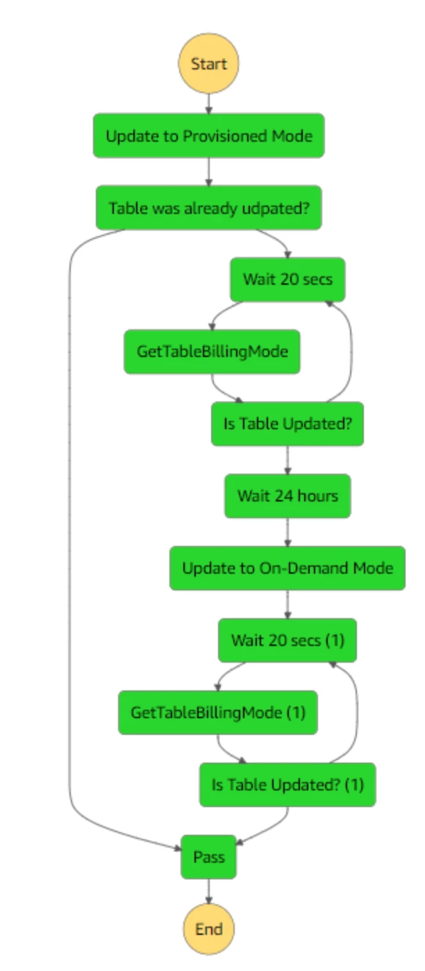 In a step function, we have setup the logic to perform the mode update. When we change from on-demand to provisioned, we will have to keep the provisioned mode for 24 hours, since DynamoDB only allows one switch every 24 hours. After that, we can switch back to on-demand. We also need to check if we already have an update in-progress for a given table. In that case, we will skip the flow.