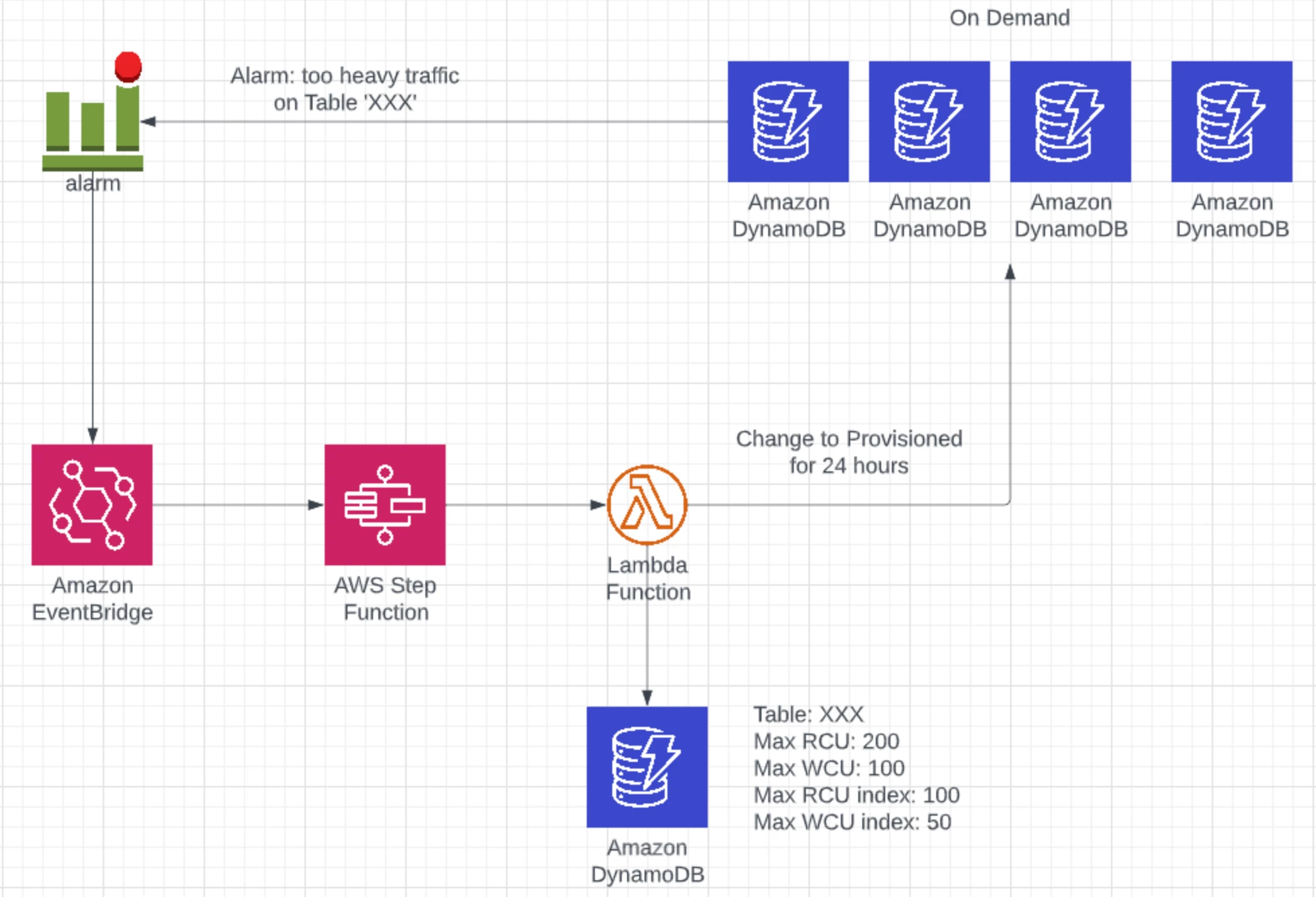 When we receive any of these alarms, we trigger a step function, which will switch the mode of the table from on-demand to provisioned. In order to establish the limits for each table, we store those values in a DynamoDB table.